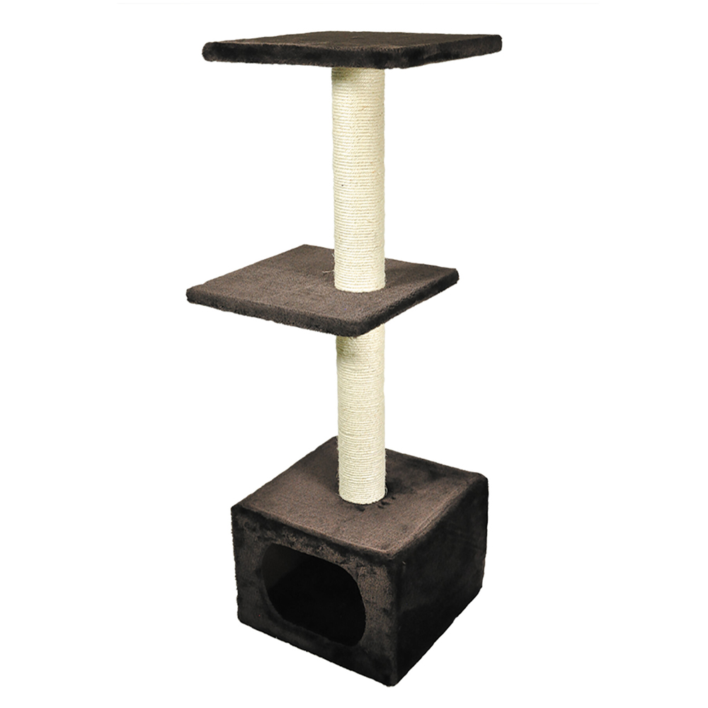 Κλασικό δέντρο γάτας ύψους 108 cm με βάση διαστάσεων 37×37 cm, καλυμμένο με καφέ πλατφόρμα, κουβέρτα και στύλο από σχοινί sisal – σχεδιασμένο για να ενισχύει το τρίψιμο, τα άλματα και την ξεκούραση της γάτας σε περιορισμένους χώρους.