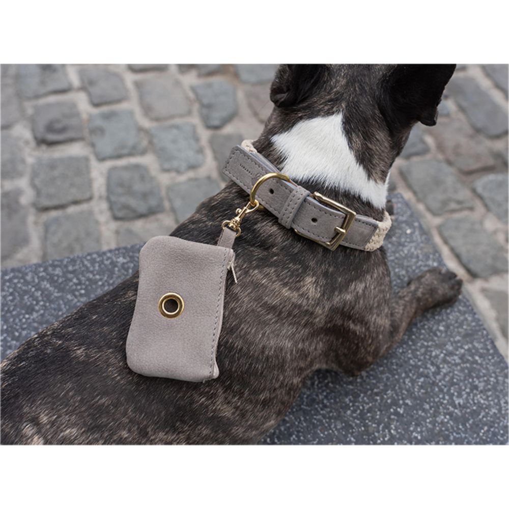 Κομψός διανομέας σακουλών απορριμμάτων σκύλων από nubuck δέρμα σε γκρι χρώμα — πρακτικό αξεσουάρ βόλτας.