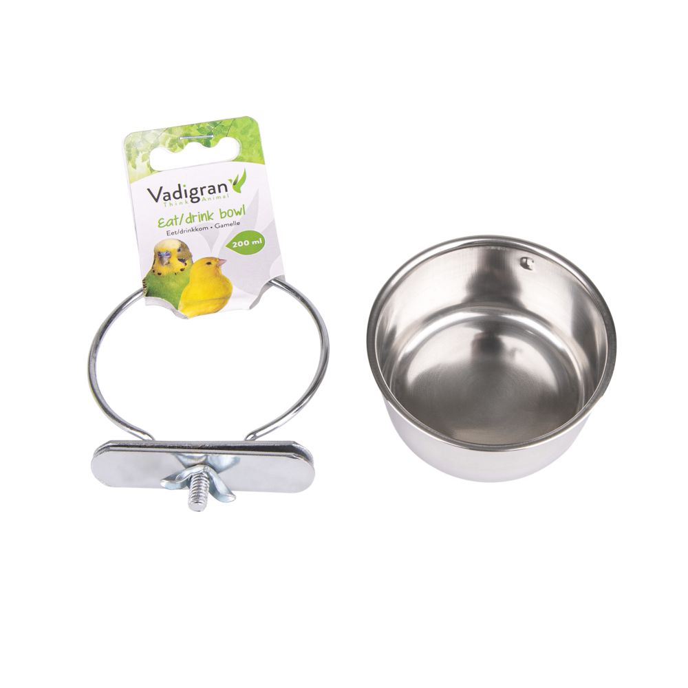Ταΐστρα πτηνών από ανοξείδωτο ατσάλι με διάμετρο 7.5 cm και χωρητικότητα 0.20 l, σχεδιασμένη για τοποθέτηση σε κλουβί με παξιμάδι στερέωσης. Κατάλληλη για καθημερινή προσφορά σπόρων ή μικρών μείγματων τροφής, με ανθεκτική και εύκολη στη συντήρηση κατασκευή.