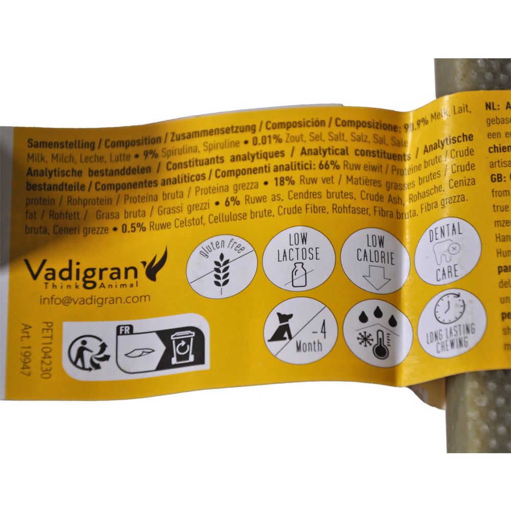Το Vadigran Fromagerie Cheese Bone Spirulina είναι φυσική λιχουδιά μάσησης για σκύλους από 99,9% γάλα με προσθήκη σπιρουλίνας, που προσφέρει παρατεταμένη απασχόληση και υποστήριξη της στοματικής υγείας με σκληρή υφή που ενθαρρύνει τη μάσηση και βοηθά στον μηχανικό καθαρισμό των δοντιών. Η φυσική σύνθεση χωρίς συντηρητικά και χρωστικές και η παραδοσιακή διαδικασία ξήρανσης προσφέρουν πλούσια γεύση και θρεπτικά στοιχεία.