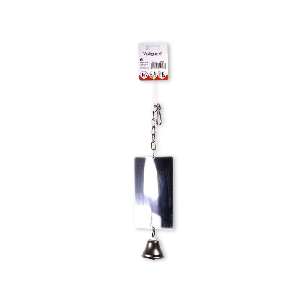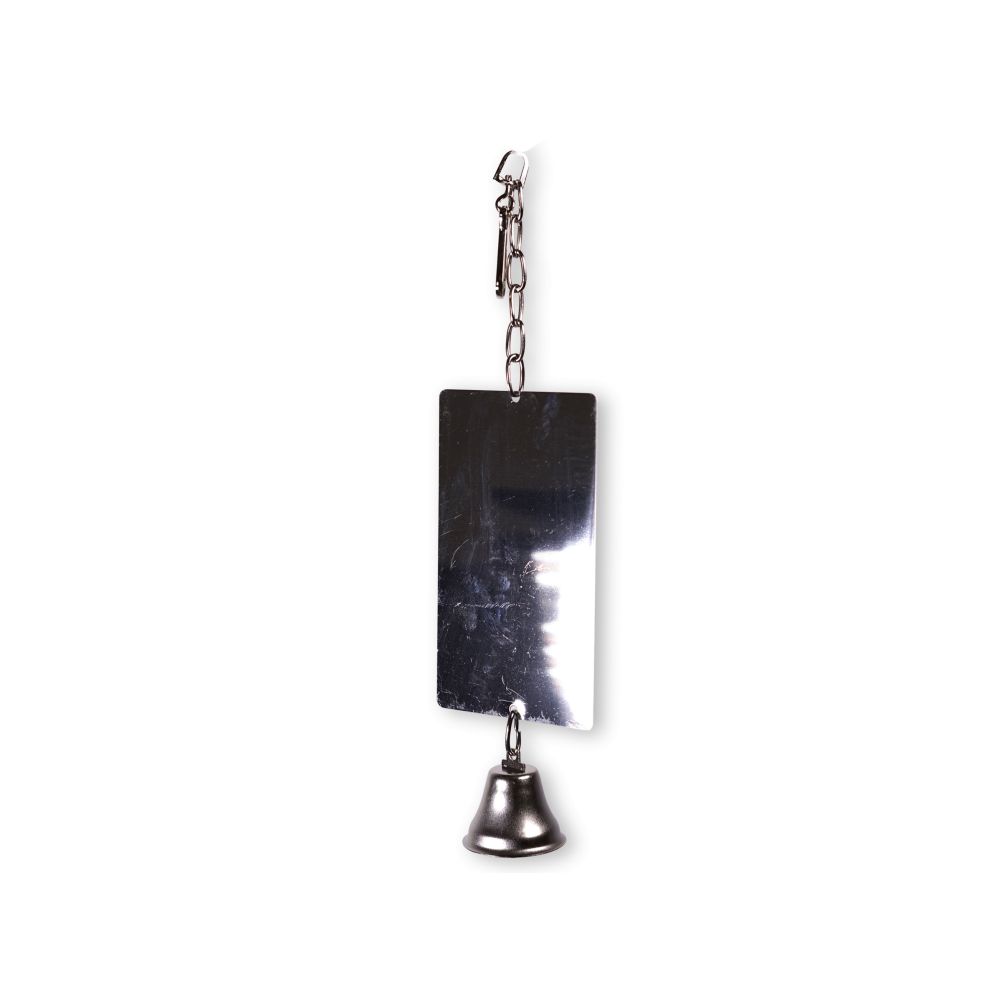 Ορθογώνιος μεταλλικός καθρέφτης με καμπανάκι μήκους 15×9 cm, σχεδιασμένος για να προσφέρει ψυχαγωγία, οπτική διέγερση και ήχο στα πτηνά εντός του κλουβιού. Ο καθρέφτης ενθαρρύνει την αλληλεπίδραση και το παιχνίδι, ενώ το καμπανάκι προσφέρει ηχητική κινητική διέγερση.