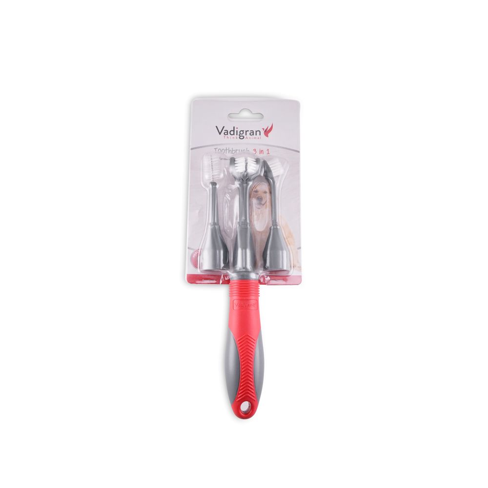 Η Vadigran Οδοντόβουρτσα Toothbrush 3 in 1 είναι σχεδιασμένη για να διευκολύνει τον τακτικό καθαρισμό των δοντιών του σκύλου, συμβάλλοντας στη μείωση της πέτρας και της κακοσμίας. Ο εργονομικός σχεδιασμός και η λαστιχένια, αντιολισθητική λαβή προσφέρουν άνεση και σταθερό κράτημα κατά τη χρήση.