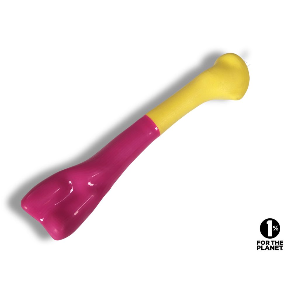 Παιχνίδι κόκκαλο από καουτσούκ TPR σε χρώματα ροζ‑κίτρινο. Διάσταση 32 cm και βάρος 240 gr. Ιδανικό για ενεργό παιχνίδι ρίψεων και ανάκτησης.