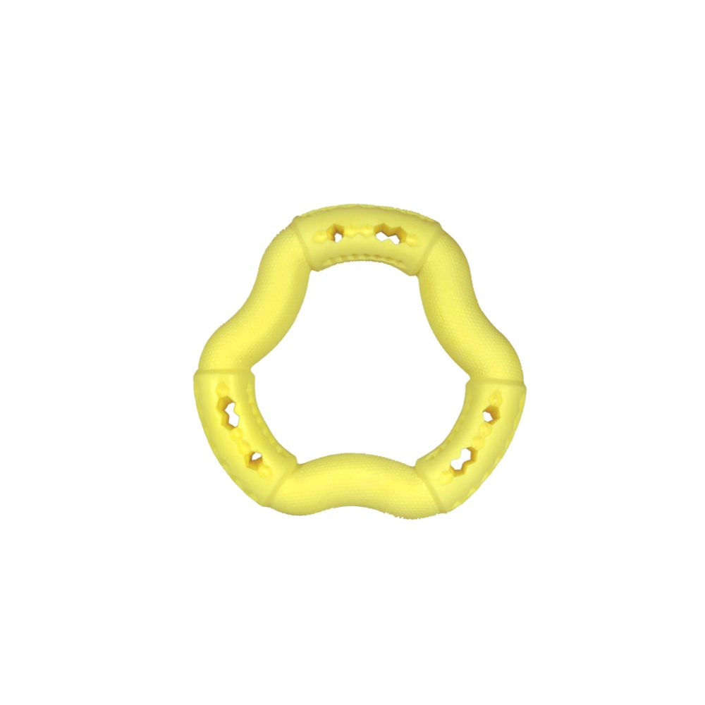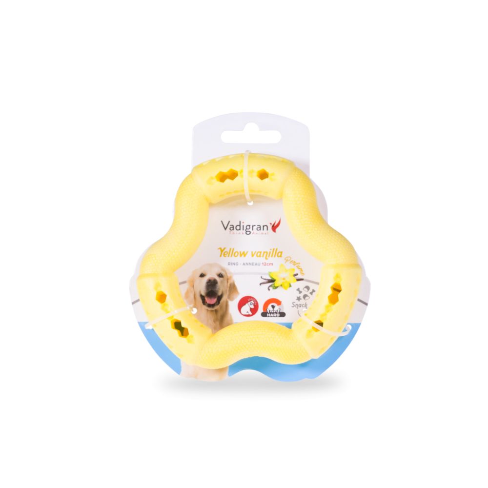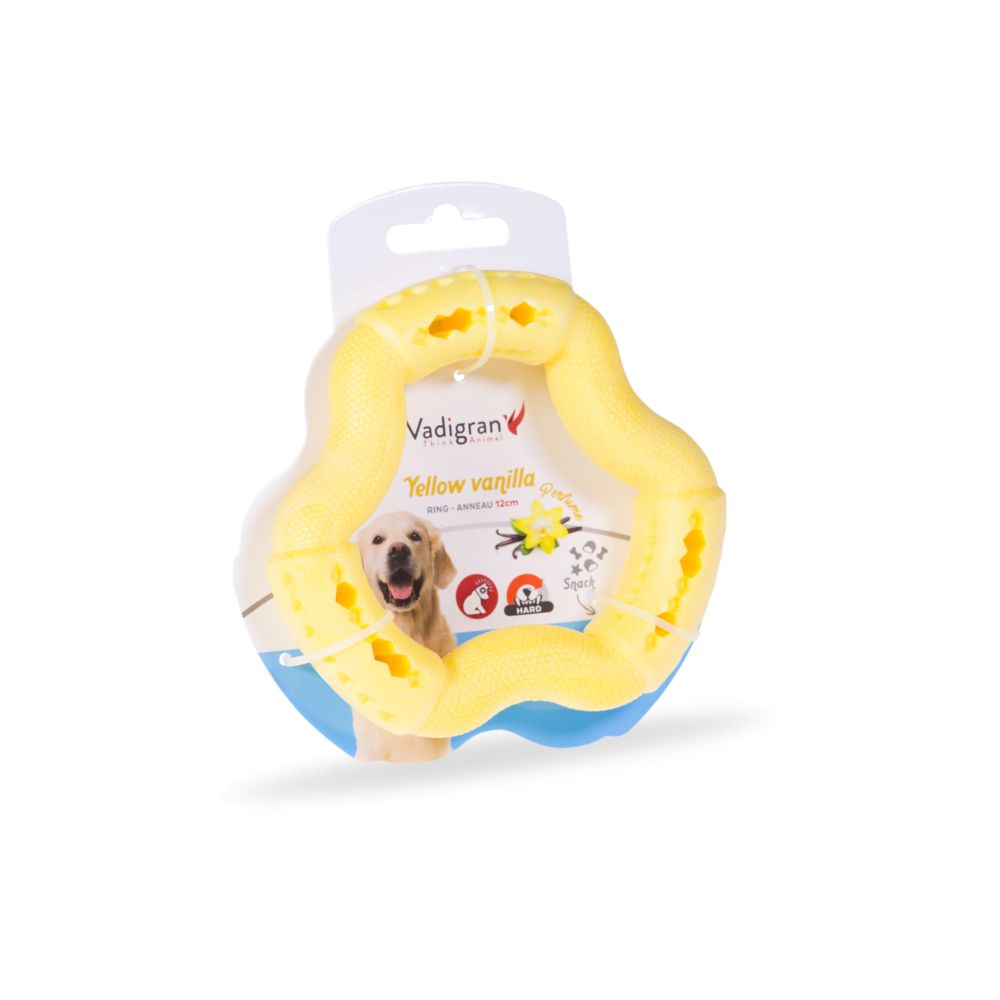 Το Vadigran Παιχνίδι Καουτσούκ TPR Ring Κίτρινο-Βανίλια 12cm 80gr είναι ένα ανθεκτικό παιχνίδι για σκύλους από θερμοπλαστικό καουτσούκ (TPR). Με έντονο άρωμα βανίλιας και σχεδιασμό σε σχήμα δαχτυλιδιού, προσφέρει μεγάλα επίπεδα διασκέδασης και ενθάρρυνσης του παιχνιδιού. Ιδανικό για ρίψεις, ανάκτηση και μάσηση που συμβάλλει στη στοματική υγιεινή.