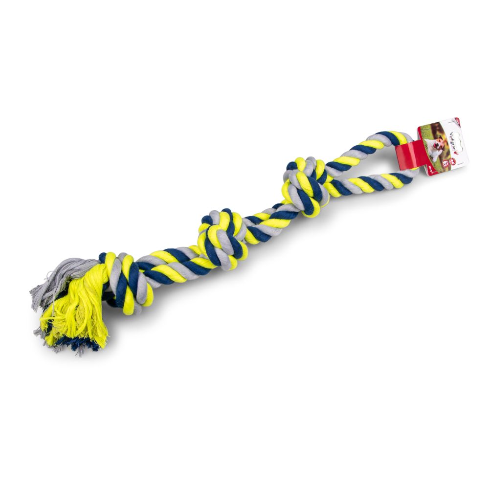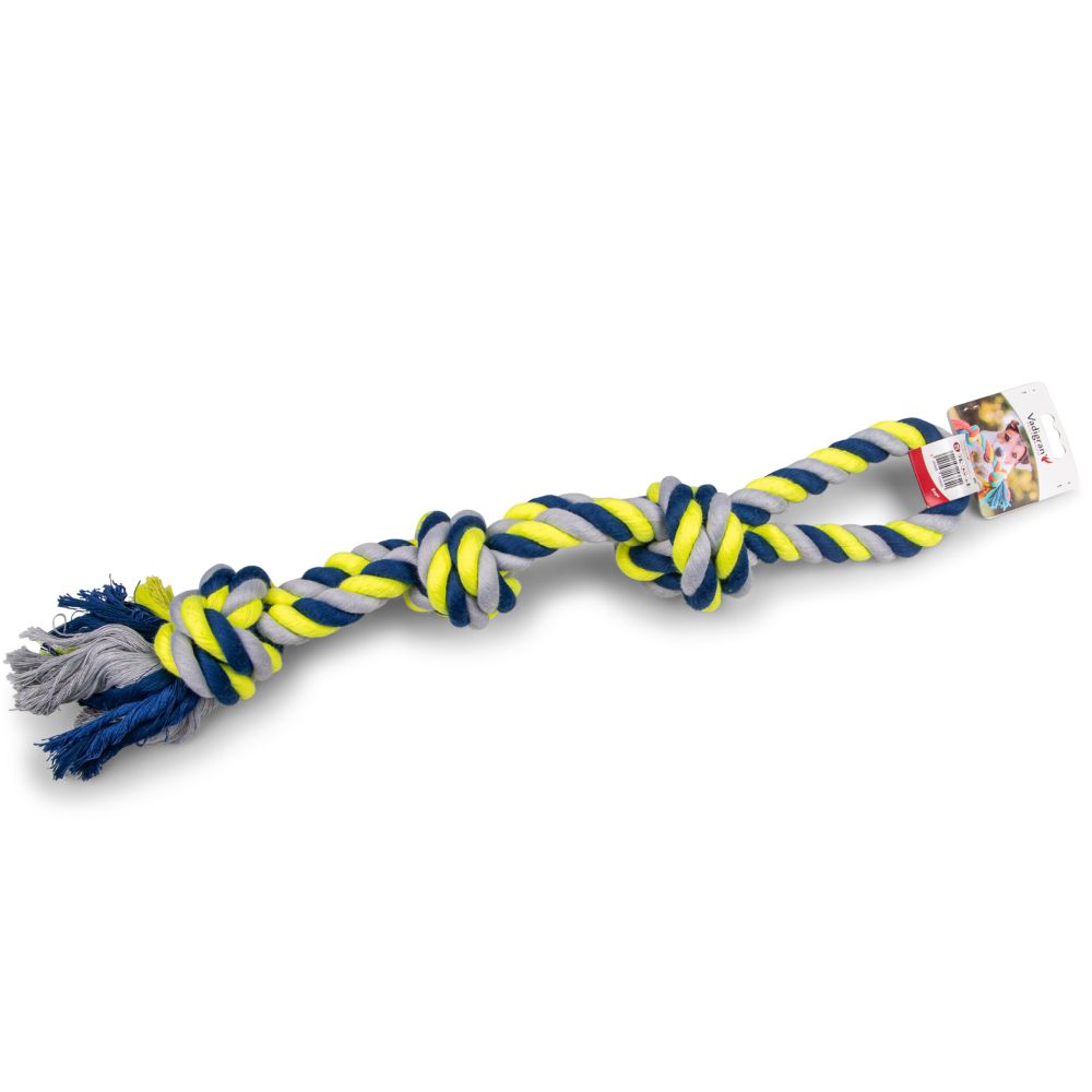 Το Vadigran Σχοινί Βαμβακερό 3 Κόμποι Μπλε-Κίτρινο 60cm 600gr είναι κατασκευασμένο από υψηλής ποιότητας βαμβάκι και σχεδιασμένο για ενεργητικές δραστηριότητες μαζί με τον σκύλο. Η τριπλή κόμβωση προσφέρει εξαιρετικό κράτημα και ασφάλεια στο παιχνίδι.