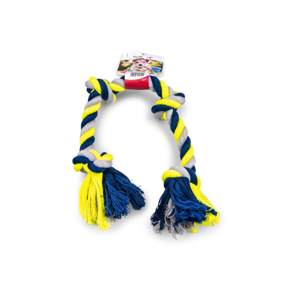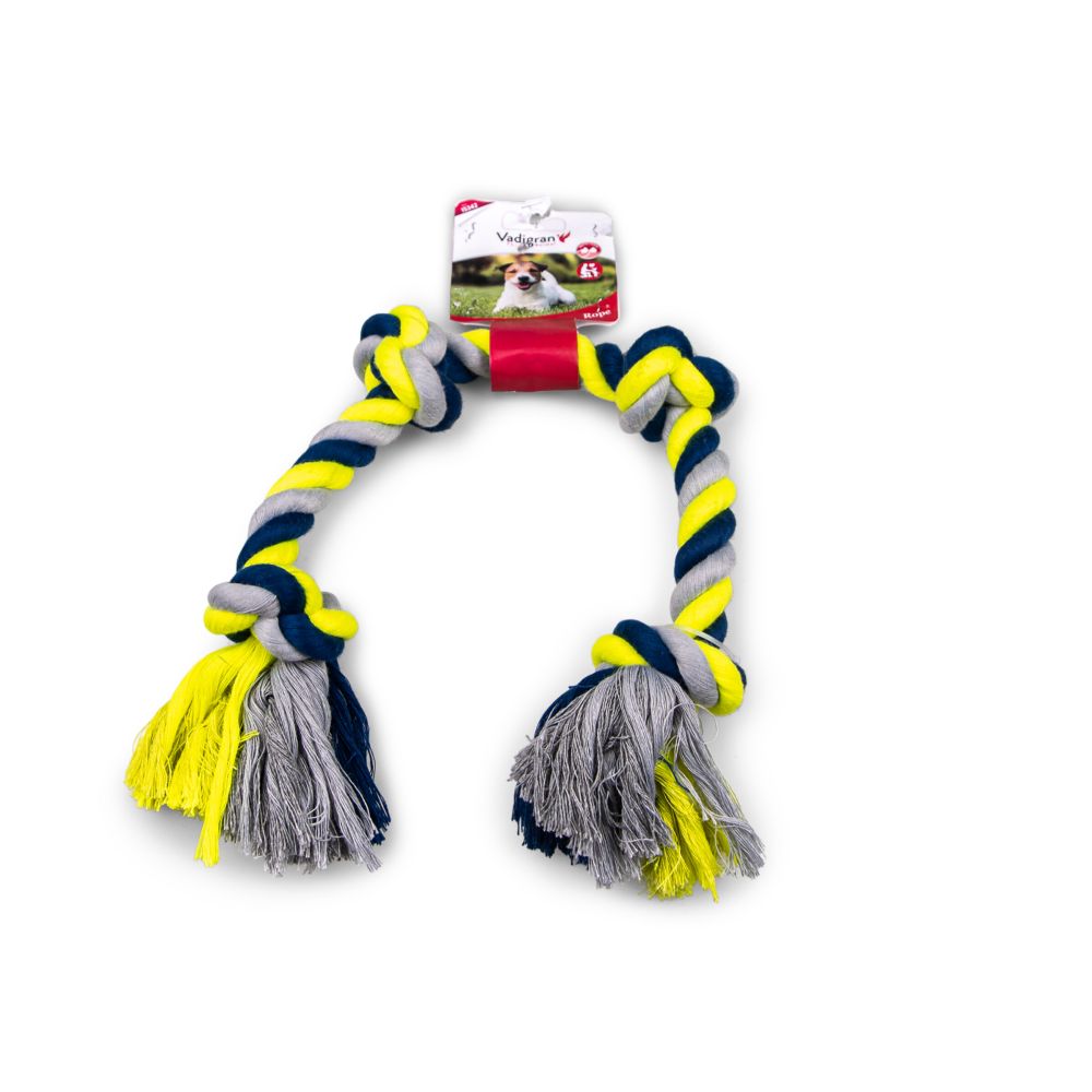Το Vadigran Σχοινί Βαμβακερό 4 Κόμποι Μπλε-Κίτρινο 58cm 260gr είναι κατασκευασμένο από βαμβάκι υψηλής ποιότητας και σχεδιασμένο με τέσσερις κόμπους για εξαιρετικό κράτημα και αντοχή. Ιδανικό για δραστήρια παιχνίδια τράβηγματος και ρίψεις, ενισχύει την οδοντική υγιεινή καθώς το μάσημα του υλικού βοηθά στην απομάκρυνση της οδοντικής πέτρας.