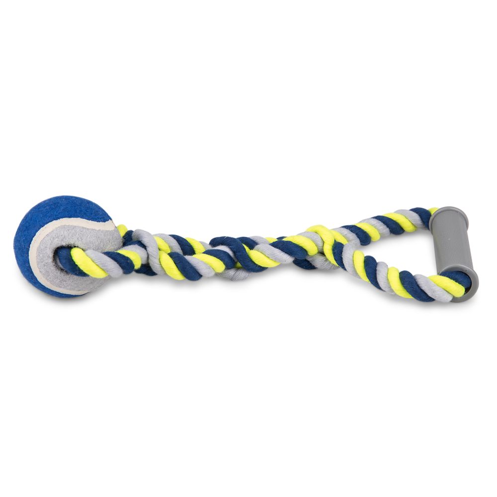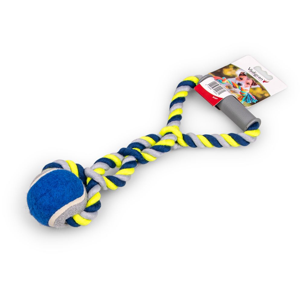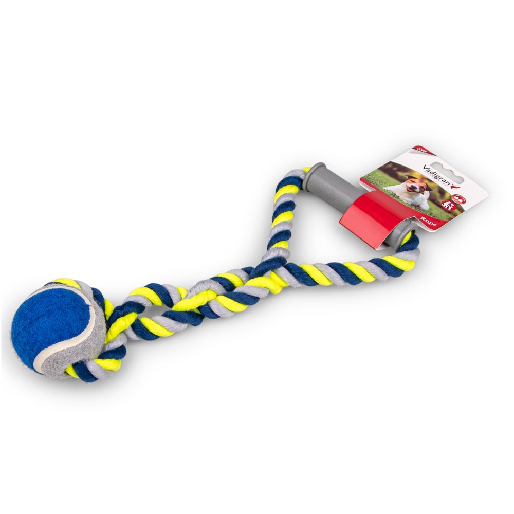 Το Vadigran Σχοινί Βαμβακερό με Πλαστική Λαβή & Τένις Μπάλα Μπλε-Κίτρινο 190 gr συνδυάζει ανθεκτικό βαμβακερό υλικό και εργονομική πλαστική λαβή για άνετη χρήση. Η ενσωματωμένη τένις μπάλα προσφέρει επιπλέον διασκέδαση μέσω ρίψεων και ανάκτησης, ενώ το σχοινί συμβάλλει στην οδοντική υγιεινή με το μάσημα του υλικού.