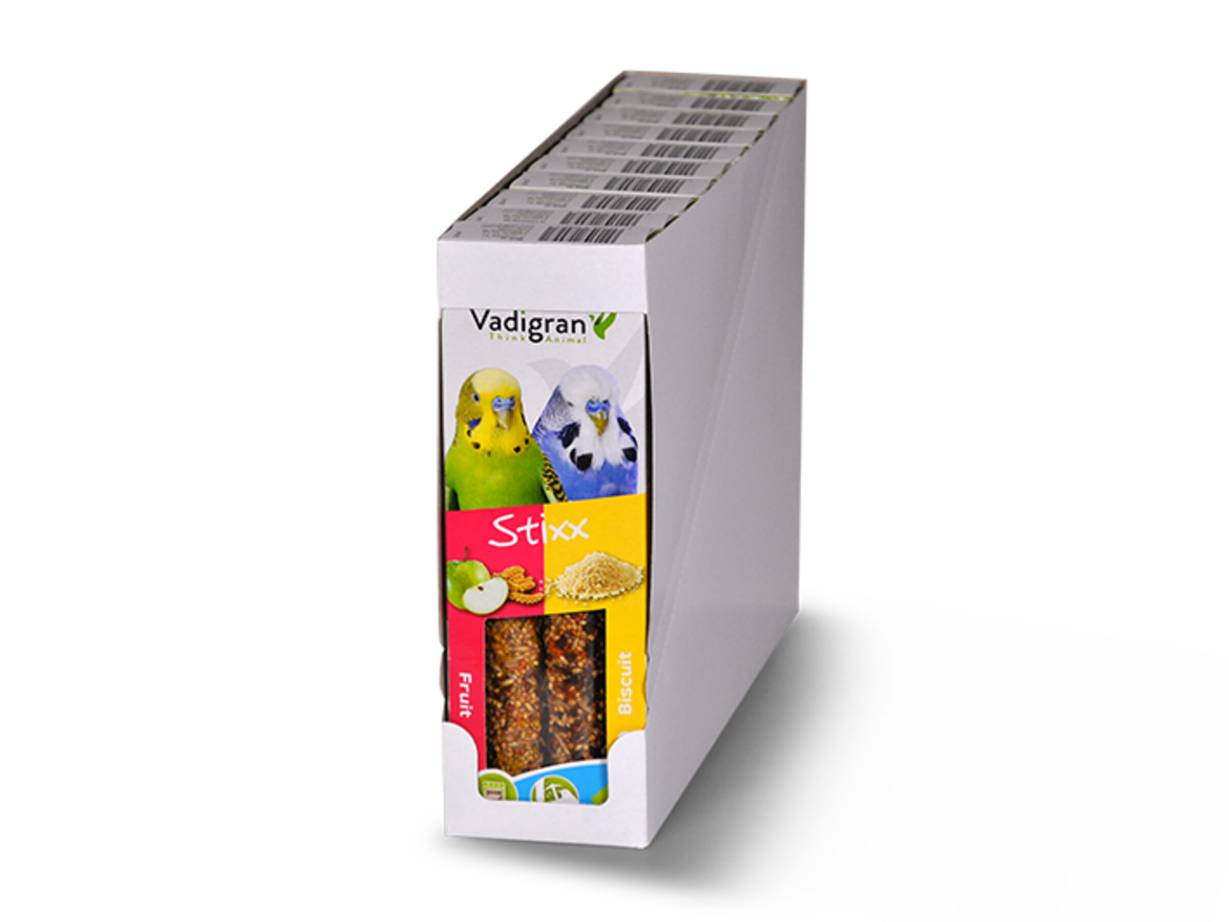 Τα Vadigran Stixx Budgie Fruit Biscuit 2 in 1 συνδυάζουν γεύση, διασκέδαση και διατροφή σε ένα προϊόν, ειδικά σχεδιασμένο για παπαγαλάκια: