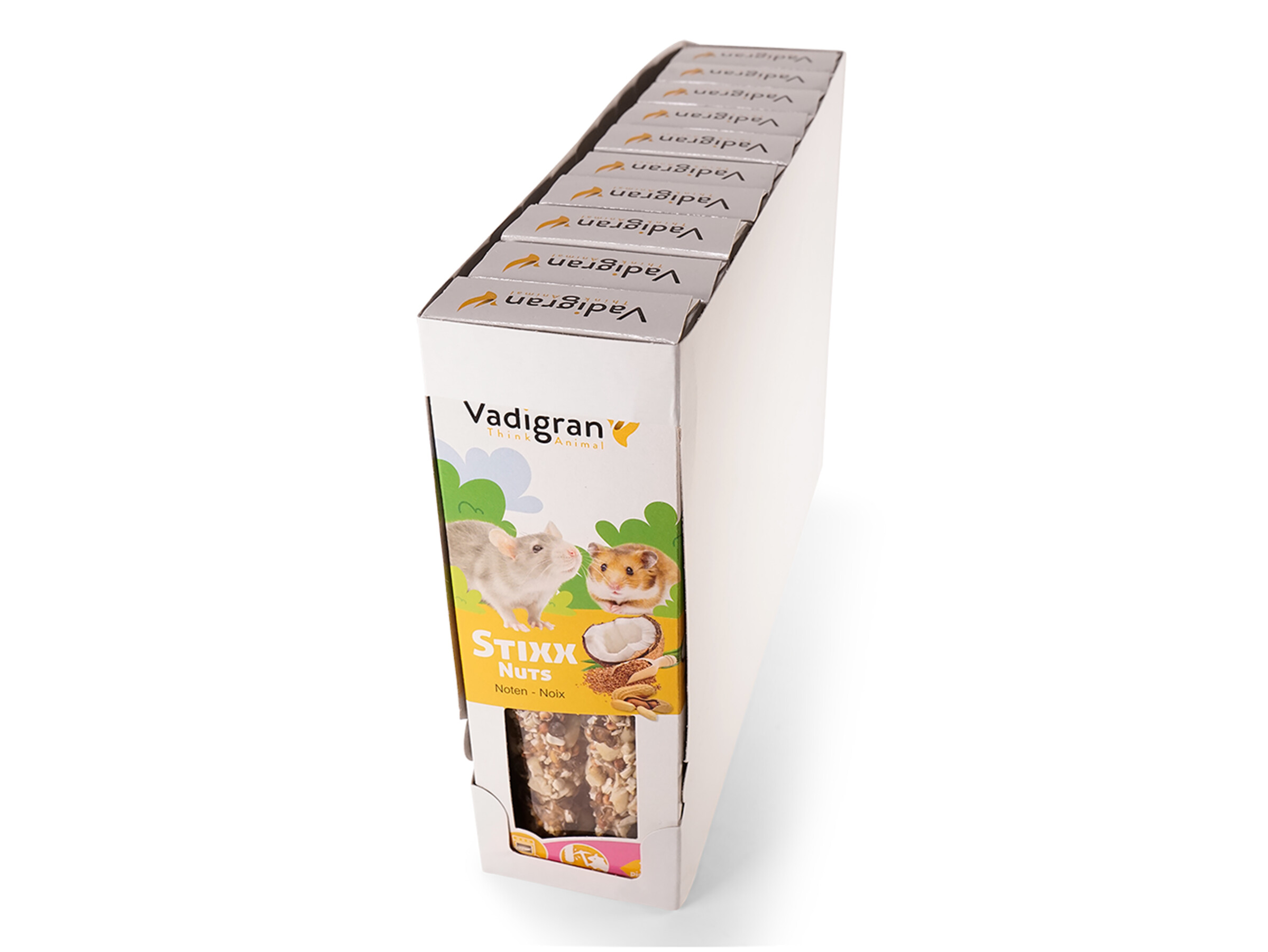 Τα Vadigran Stixx Hamster & Rat Nuts είναι ένα νόστιμο snack με ξηρούς καρπούς, ιδανικό για χάμστερ, ποντίκια και άλλα μικρά τρωκτικά: