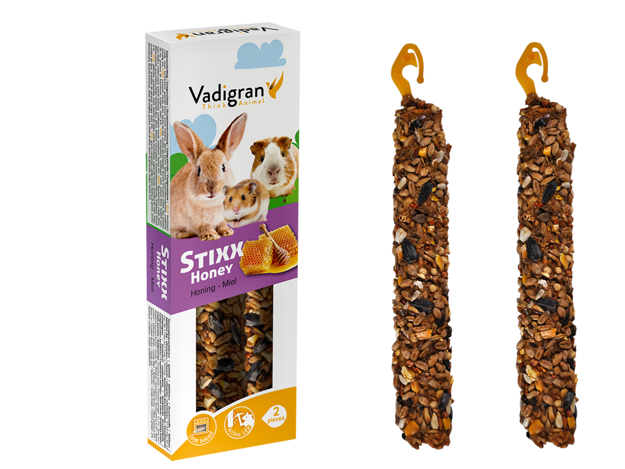 Τα Vadigran Stixx Rabbit & Guinea Pig & Hamster Honey είναι διπλό snack με μέλι, σχεδιασμένο για μικρά τρωκτικά και κουνέλια:
