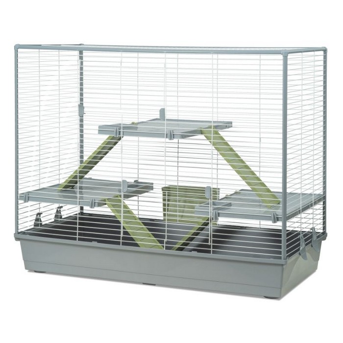 Οικολογικό προϊόν. Αυτό το κλουβί είναι ιδανικό για κουνέλια. Κατασκευασμένο με το σύστημα ταινιών Voltrega, ένα σύστημα γρήγορης συναρμολόγησης για πτυσσόμενα κλουβιά, εξοικονομεί χώρο αποθήκευσης και μεταφοράς λόγω της συμπαγούς συσκευασίας του. Περιλαμβάνει δάπεδα και σκάλες για να παρέχει περισσότερο χώρο και να διευκολύνει την άσκηση του κουνελιού, ενώ διαθέτει επίσης και ταΐστρα σανού. Κατασκευασμένο στην Ισπανία με σύρμα επικαλυμμένο με εποξειδική βαφή χωρίς μόλυβδο και χρησιμοποιώντας μόνο ανακυκλωμένο πλαστικό πολυπροπυλενίου, μη τοξικές πρώτες ύλες για το κατοικίδιό σας.