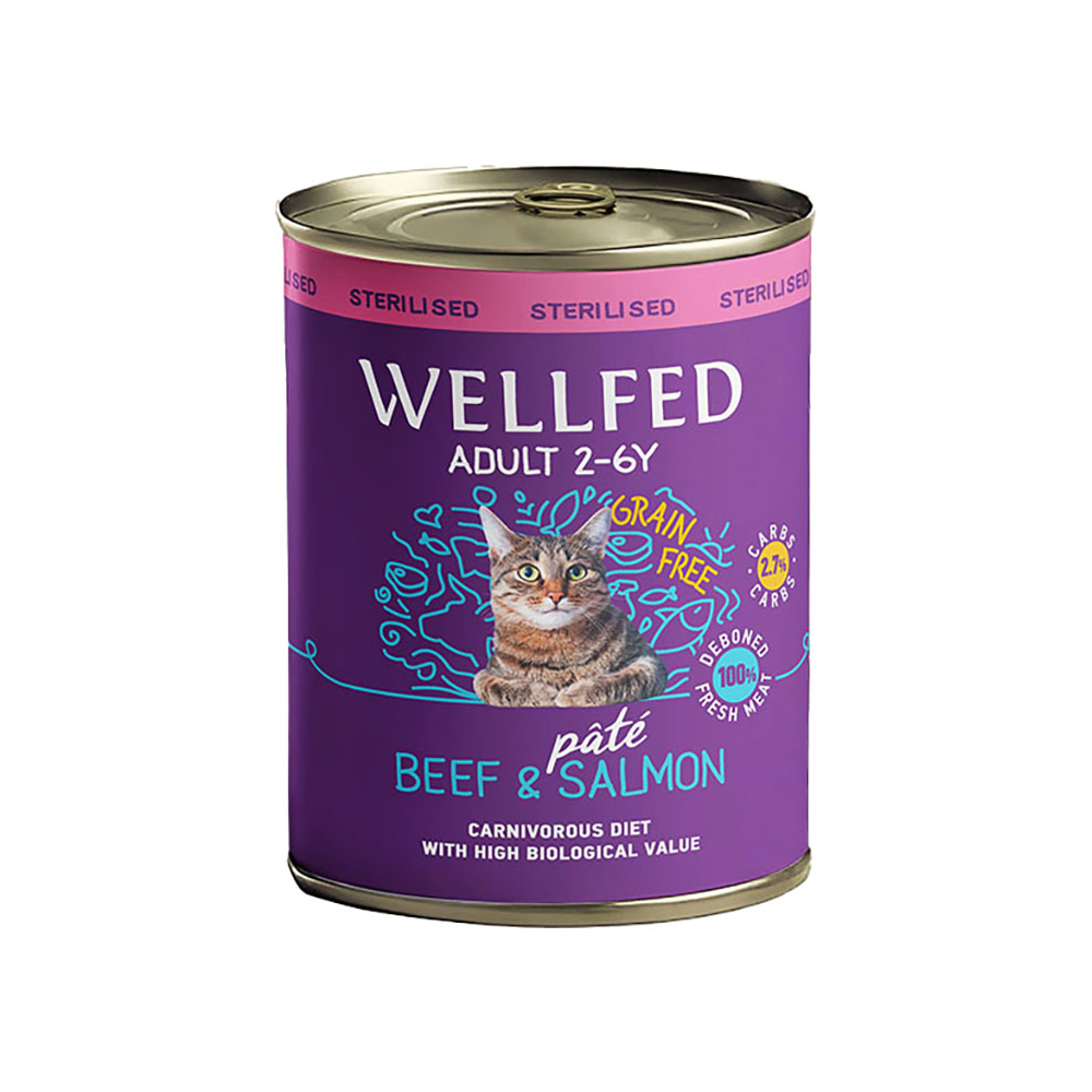 Πλήρης υγρή τροφή με βοδινό και σολομό σε πατέ για την ενήλικη στειρωμένη γατούλα σας, από 12 μηνών έως 6 ετών, που ζει μέσα στο σπίτι. Η τροφή αυτή είναι ανώτερης ποιότητας, από 100% φρέσκο κρέας μαγειρεμένο στον ατμό. Είναι εμπλουτισμένη με L-καρνιτίνη που μετατρέπει τα λιπαρά οξέα σε καθαρή ενέργεια, και με DL-μεθειονίνη που βοηθά στην οξινοποίηση των ουρών, απαραίτητα στοιχεία για μια στειρωμένη γατούλα. Δεν περιέχει σιτηρά, συντηρητικά ή τεχνητά χρώματα και έχει χαμηλή περιεκτικότητα σε μαγνήσιο.