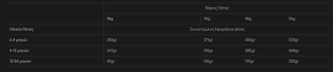 Κάθε γάτα είναι διαφορετική και η ποσότητα παρεχόμενης τροφής είναι πιθανό να αλλάζει με βάση την ηλικία και τον τρόπο ζωής της. Χρησιμοποιήστε την συνιστώμενη δόση σαν οδηγό, παρακολουθείστε το βάρος της και προσαρμόστε ανάλογα τις ποσότητες για τη μικρή μας φίλη. Ταΐστε την δύο φορές την ημέρα, έχοντας πάντα δίπλα της φρέσκο, καθαρό νερό!