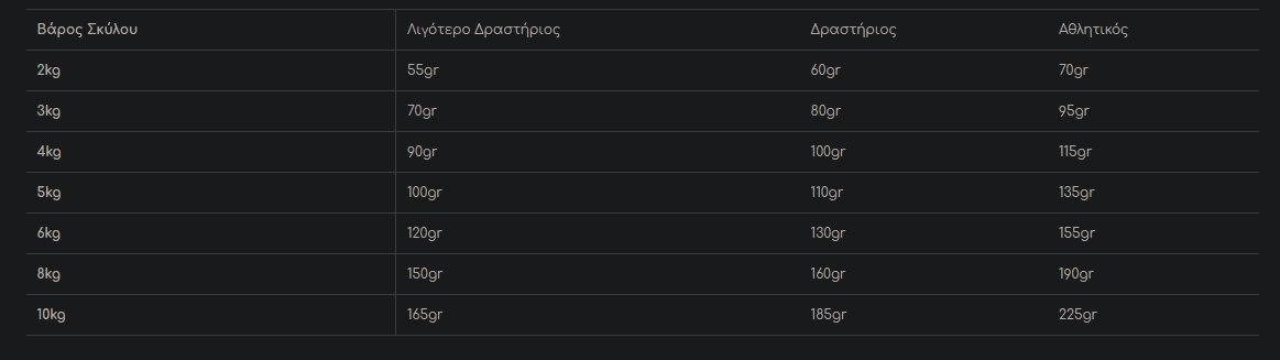 Κάθε σκύλος είναι διαφορετικός και η ποσότητα παρεχόμενης τροφής είναι πιθανό να αλλάζει με βάση την ηλικία και τον τρόπο ζωής του. Χρησιμοποιήστε την συνιστώμενη δόση σαν οδηγό, παρακολουθείστε το βάρος του και προσαρμόστε ανάλογα τις ποσότητες για τον μικρό μας φίλο. Ταΐστε τον δύο φορές την ημέρα, έχοντας πάντα δίπλα του φρέσκο, καθαρό νερό!