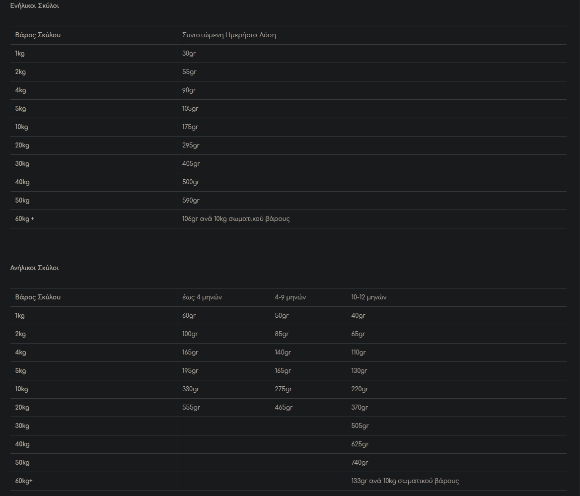 Κάθε σκύλος είναι διαφορετικός και η ποσότητα παρεχόμενης τροφής είναι πιθανό να αλλάζει με βάση την ηλικία και τον τρόπο ζωής του. Χρησιμοποιήστε την συνιστώμενη δόση σαν οδηγό, παρακολουθείστε το βάρος του και προσαρμόστε ανάλογα τις ποσότητες για τον μικρό μας φίλο. Ταΐστε τον δύο φορές την ημέρα, έχοντας πάντα δίπλα του φρέσκο, καθαρό νερό!