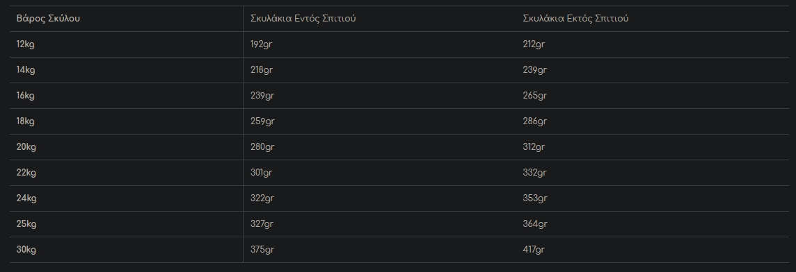 Κάθε σκύλος είναι διαφορετικός και η ποσότητα παρεχόμενης τροφής είναι πιθανό να αλλάζει με βάση την ηλικία και τον τρόπο ζωής του. Χρησιμοποιήστε την συνιστώμενη δόση σαν οδηγό, παρακολουθείστε το βάρος του και προσαρμόστε ανάλογα τις ποσότητες για τον μικρό μας φίλο. Ταΐστε τον δύο φορές την ημέρα, έχοντας πάντα δίπλα του φρέσκο, καθαρό νερό!