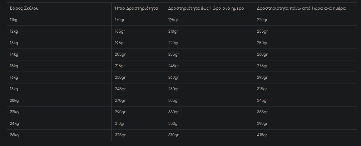 Κάθε σκύλος είναι διαφορετικός και η ποσότητα παρεχόμενης τροφής είναι πιθανό να αλλάζει με βάση την ηλικία και τον τρόπο ζωής του. Χρησιμοποιήστε την συνιστώμενη δόση σαν οδηγό, παρακολουθείστε το βάρος του και προσαρμόστε ανάλογα τις ποσότητες για τον μικρό μας φίλο. Ταΐστε τον δύο φορές την ημέρα, έχοντας πάντα δίπλα του φρέσκο, καθαρό νερό!