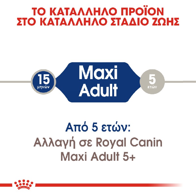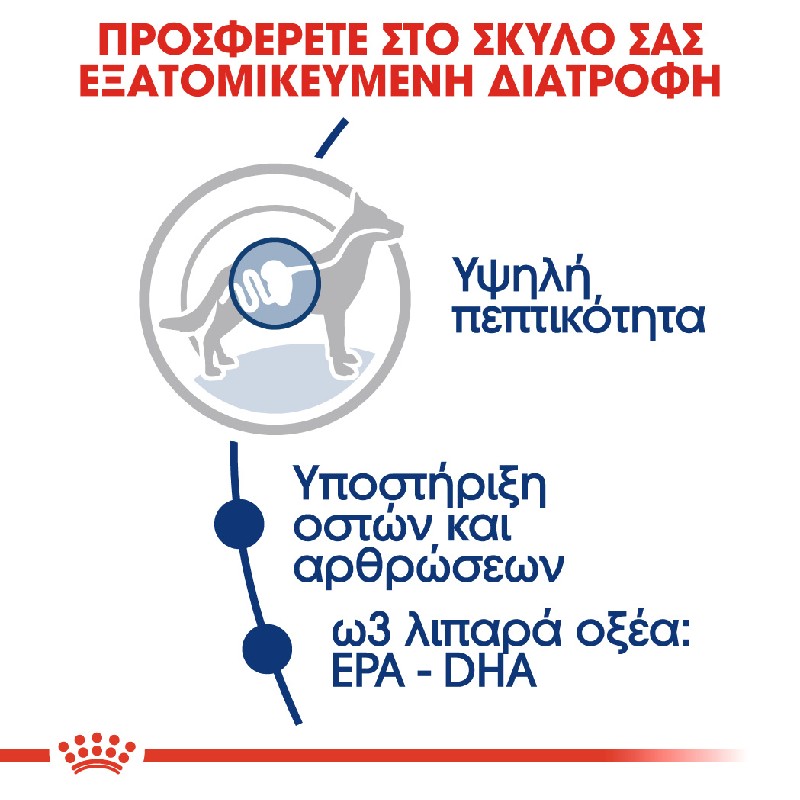 Πλήρης τροφή με πουλερικά, για ενήλικους σκύλους μεγαλόσωμων φυλών, από 15 μηνών έως 5 ετών, με σωματικό βάρος 26-44kg. Είναι μια διατροφικά πλήρης και ισορροπημένη τροφή, ειδικά σχεδιασμένη ώστε να ικανοποιεί τις ιδιαίτερες ανάγκες του μεγαλόσωμου σκυλάκου σας και να τον υποστηρίζει σε όλη τη διάρκεια της ενήλικης ζωής του. Οι μεγαλόσωμοι σκύλοι, με τον παρατεταμένο χρόνο πεπτικής διάβασης, είναι πιο επιρρεπείς σε πεπτικές ευαισθησίες σε σύγκριση με τις πιο μικρόσωμες φυλές. Γι΄αυτό το λόγο η τροφή περιέχει εξαιρετικά εύπεπτες πρωτεΐνες και μια ισορροπημένη ποσότητα φυτικών ινών που υποστηρίζει την υγεία του πεπτικού συστήματος. Επίσης, οι μεγαλόσωμοι σκύλοι εναποθέτουν το μεγαλύτερο μέρος του σωματικού τους βάρους στις αρθρώσεις τους. Η συγκεκριμένη φόρμουλα είναι ειδικά παρασκευασμένη με ένα συνδυασμό μεταλλικών στοιχείων και θρεπτικών ουσιών για την υποστήριξη της υγείας των οστών και των αρθρώσεων. Περιλαμβάνει ένα μείγμα βιταμινών και θρεπτικών ουσιών υψηλής ποιότητας για μέγιστη απορρόφηση που υποστηρίζει τη συνολική υγεία του μικρού μας φίλου. Το μοναδικό μέγεθος και σχήμα της κροκέτας έχουν προσαρμοστεί έτσι ώστε να ταιριάζουν στο ξεχωριστό σαγόνι του σκυλάκου σας και να τον ενθαρρύνουν να μασά σωστά την τροφή του, προσφέροντας μια μηχανική δράση βουρτσίσματος που βοηθά στη διατήρηση της οδοντικής υγείας.
