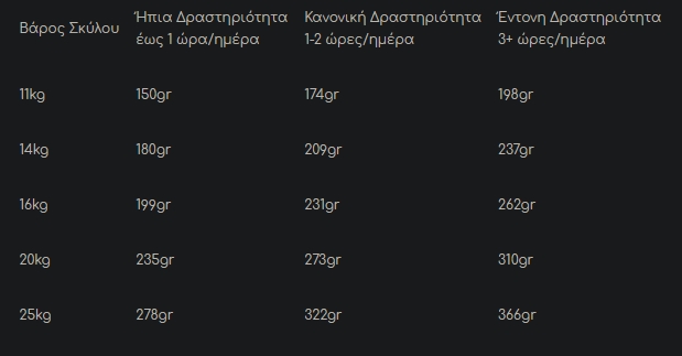 Κάθε σκύλος είναι διαφορετικός και η ποσότητα παρεχόμενης τροφής είναι πιθανό να αλλάζει με βάση την ηλικία και τον τρόπο ζωής του. Χρησιμοποιήστε την συνιστώμενη δόση σαν οδηγό, παρακολουθείστε το βάρος του και προσαρμόστε ανάλογα τις ποσότητες για τον μικρό μας φίλο. Ταΐστε τον δύο φορές την ημέρα, έχοντας πάντα δίπλα του φρέσκο, καθαρό νερό!