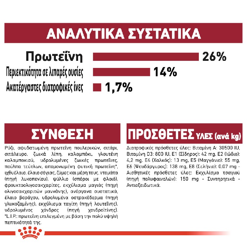 Αφυδατωμένη πρωτεΐνη πουλερικών, σιτάλευρο, αραβόσιτος, αλεύρι αραβόσιτου, ρύζι, ζωικά λίπη, γλουτένη αραβόσιτου, σιτάρι, πούλπα τεύτλων, υδρολυμένες ζωικές πρωτείνες, γλουτένη σιταριού, ιχθυέλαιο, έλαιο σόγιας, προιόντα ζυμών, ανόργανα συστατικά, ψύλλιο (σπόροι με φλοιό), φρουκτο-ολιγοσακχαρίτες, έλαιο φυκών Schizochytriumsp. (πηγή EPA & DHA), ζύμες (πηγή ολιγοσακχαρίτων μαννάνης), γλυκοζαμίνη από ζύμωση, άλευρο ταγέτη, υδρολυμένoς χόνδρος (πηγή χονδροϊτίνης).
