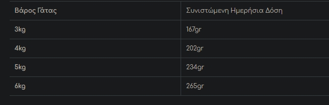 Κάθε γάτα είναι διαφορετική και η ποσότητα παρεχόμενης τροφής είναι πιθανό να αλλάζει με βάση την ηλικία και τον τρόπο ζωής της. Χρησιμοποιήστε την συνιστώμενη δόση σαν οδηγό, παρακολουθείστε το βάρος της και προσαρμόστε ανάλογα τις ποσότητες για τη μικρή μας φίλη. Ταΐστε την δύο φορές την ημέρα, έχοντας πάντα δίπλα της φρέσκο, καθαρό νερό!