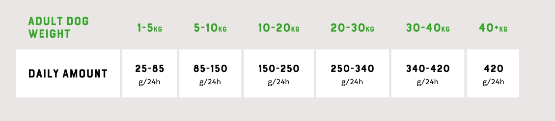 • Η όρεξη κάθε σκύλου διαφέρει ανάλογα με το μέγεθος, την ηλικία, την κατάσταση και το επίπεδο δραστηριότητας. Παρακαλούμε προσαρμόστε την ποσότητα που δίνεται για να διατηρείτε τον σκύλο σας σε μια λεπτή και δραστήρια κατάσταση. Να διασφαλίζετε πάντα ότι υπάρχει διαθέσιμο καθαρό πόσιμο νερό.