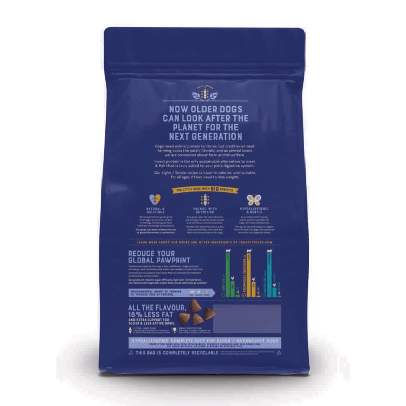 Πλήρης υποαλλεργική τροφή με πρωτεΐνη εντόμων και χαμηλά λιπαρά, για το ηλικιωμένο ή λιγότερο δραστήριο σκυλάκι σας. Η τροφή αυτή ενδείκνυται απολύτως ως υποαλλεργική δίαιτα, για την ελαχιστοποίηση της διατροφικής δυσανεξίας. Περιέχει πρωτεΐνη εντόμων φιλική προς τον πλανήτη, βρώμη και παντζάρια που είναι πλούσια σε αδιάλυτες ίνες οι οποίες προάγουν την καλή κινητικότητα του εντέρου και βοηθούν στον έλεγχο των τριχοβεζωάριων. Επίσης, περιέχει φύκια της θάλασσας και σωστά επίπεδα γλυκοζαμίνης και χονδροϊτίνης που βοηθούν στη φροντίδα και τη διατήρηση υγιών αρθρώσεων. Επιπλέον, τα λιπαρά οξέα μέσης αλυσίδας (MCFAs) που περιέχονται στις προνύμφες εντόμων βελτιώνουν την πνευματική και ψυχική υγεία των ηλικιωμένων σκυλάκων. Είναι εξαιρετικά εύπεπτη και γευστική, και ο μικρός μας φίλος θα τη λατρέψει.